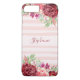 Cette couverture de téléphone florale personnalisée présente des rayures rose vif avec des roses et des fleurs de couleur bordeaux et bordeaux. Personnalisez-le avec un nom.