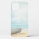 Un étui téléphonique avec une belle image rustique. Couleurs subtiles de bleu clair, marron sablonneux et blanc doux. Une scène de plage avec un bateau sur le rivage avec un filet de pêche accroché à côté. Un élégant look défraîchi.