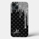 Coque iphone chic avec un gris sur pois noir motif, et des graphiques de parties scintillant argentée coulant vers le bas. Personnalisez le monogramme personnalisé d'une lettre, dans le coin en bas à gauche, à ce grand coque. Le moyen parfait de protéger votre téléphone, et l'apparence élégant aussi.