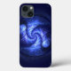 Présente une image fractale bleue rotationnelle d'un mécanisme métallique articulé.