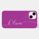 Purple White Elegant Calligraphy Script Personnalisé Nom iPhone 14 Smart Phone Boîtes dispose d'un design moderne et tendance simple et élégant avec votre nom personnalisé dans élégante calligraphie manuscrite typographie de script sur un arrière - plan violet. Conçu par ©Evco Studio www.zazzle.com/store/evcostudio