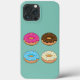 Illustration de quatre beignets assortis, fraise rose, chocolat brun, bubblegum bleu et chocolat blanc avec des arômes colorés pour les valentines sucrées en arrière - plan turquoise. Ce dessin animé mignon motif est une idée cadeau pour les amateurs de douceurs et de desserts, et les amateurs de beignets.