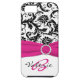 La caisse florale rose, noire, et blanche moderne décorée d'un monogramme de l'iPhone 5 de Vibe™ de Coque-Compagnon de damassé avec une rose indien A IMPRIMÉ le ruban et A IMPRIMÉ la boucle de bijou là-dessus.