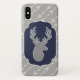 Boîtier téléphonique de style rustique moderne avec silhouette de buste de cerf gris, cadre de support bleu marine foncé, flèches blanches sur gris.