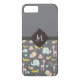 Boîtier de téléphone Whimsical avec un motif composé d'une collection d'animaux sauvages mignons dans un style pépinière d'art - y compris les alligators, singes, oiseaux, tortues, girafes, éléphants et lions tous dessinés dans des couleurs pastel. Placez-vous sur un arrière - plan marron. Le centre a un cadre en losange brun fait d'aquarelles, avec votre monogramme personnalisé à l'intérieur.