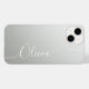 Silver Shimmer White Elegant Calligraphy Script Personnalisé Nom iPhone 14 Smart Phone Boîtes dispose d'un design moderne et tendance simple et élégant avec votre nom personnalisé dans élégante écriture calligraphie script typographie sur un arrière - plan brillant argent métallique. Conçu par ©Evco Studio www.zazzle.com/store/evcostudio