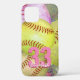 Coque robuste iPhone softball fille avec des softballs rose et jaune vif et personnalisable numéro de maillot et nom par katz_d_zynes ::: également disponible pour d'autres modèles iPhone ainsi que les appareils iPad et Samsung ... pour d'autres appareils, sélectionnez votre type d'appareil dans la section "Options de style" de cette page ... pour l'aide sur la personnalisation Lien Designer" ci-dessous