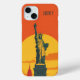 Ce coque iPhone 15 présente une illustration pop-art de la Statue de la Liberté. L'aménagement est décoré dans des tons chauds et relaxants.
