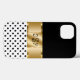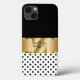 Étui de smartphone élégant dans un design élégant et stylé comprenant des éléments de design en or simulés imprimés numériquement sur la couverture, des pois noirs et blancs chic, et les initiales de nom de monogramme que vous pouvez personnaliser et faire vôtre. Conçu pour les dames ou les filles qui aiment transporter leur téléphone portable avec style.
