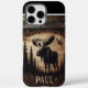 Une enseigne en bois sur mesure présente une silhouette d'orignal debout dans une forêt, portant le nom Paul sculpté en dessous. L'arrière - plan est un grain de bois rustique avec un effet brûlé, ajoutant au charme rustique.