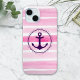 Boîtier de téléphone tendance et girly avec aquarelle rose rayé motif et ancre nautique.