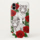 L'image présente deux majestueux tigres blancs placés au milieu de roses rouges vibrantes. Les tigres, avec leurs motifs en fourrure frappants, dégagent un sentiment de grâce et de puissance. Les feuilles verdoyants qui entourent les fleurs rehaussent le contraste saisissant, créant un mélange harmonieux de la beauté de la nature. La composition globale est dynamique, les tigres apparaissant alerte et positionnés, tandis que les roses ajoutent une touche romantique, rendant la scène visuellement captivante.