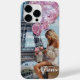 Romantique belle Girl Eiffel Tower Mate iPhone 14 Pro Max Coque est la plus belle tour de Paris et la belle fille tenant un bouquet de fleur belle et un tas de ballons roses dans ses mains est plus romantique et cette tour de Paris est très belle dans la ville de Paris. Et l'arrière - plan bleu clair façonne ces boîtiers téléphoniques.