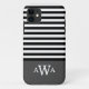 Motif rayé tendance, chic, girly, noir et blanc avec bordure en bloc gris foncé avec un modèle triple monogramme pour vous permettre de personnaliser facilement avec vos lettres initiales de premier, dernier et moyen nom.