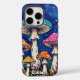 Ce tableau représente un bosquet fantastique et surréaliste de champignons sous un ciel bleu profond et étoilé. L'oeuvre se caractérise par une texture impasto lourde, avec des coups de pinceau épais et expressifs qui donnent aux champignons une qualité sculptée et tangible. Le champignon central a un casquette turquoise de premier plan avec des taches blanches, entouré de petits champignons aux casquettes orange et rose. Les champignons sont nichés au milieu d'un feuillage vert luxuriant et de fleurs roses et blanches vibrantes, créant une scène fantaisiste et autrement mondaine.