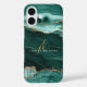 Boîtier de téléphone portable moderne et élégant avec des accents d'agate turquoise turquoise et de marbre et de parties scintillant dorée personnalisées avec des initiales et nom chic manuscrits monogramme. Contactez le concepteur via Zazzle Conversation ou makeitaboutyoustore@gmail.com si vous souhaitez modifier ce design, sur un autre produit ou pour coordonner des éléments.