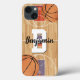 Cette étui téléphonique personnalisée a un design de fans de basket avec un terrain de basket et deux balles de basket illustrées. Personnalisé ce cas de téléphone avec un prénom ou un nom de famille et une initiale. Un grand cadeau sportif personnalisé pour donner au fan de basket de votre vie qui joue aux jeux de cartes.