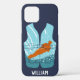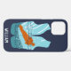 Créez un cadeau personnalisé qui conviendra parfaitement aux amateurs de ski nautique et de sports nautiques. Ce boîtier de téléphone cellulaire présente l'illustration d'un skieur d'eau orange, bleu clair et bleu turquoise en forme de gilet de sauvetage contre un arrière - plan bleu marine. Ci-dessous est un endroit pour ajouter un nom en lettres blanches.