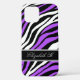Coque iphone personnalisé élégant et personnalisé avec votre nom, et conçu avec un motif imprimé zèbre avec bandes zèbres noires, blanches et violettes. C'est le coque iphone personnalisé parfait pour toute personne qui aime les motifs d'impression zèbre et la couleur violet. Choisissez votre modèle iPhone pour sélectionner la taille de coque correcte.