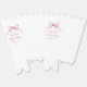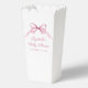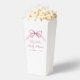 Cute party favour popcorn boxes for your baby girl shower featuring soft pink coquette bow watercolors. The words "Baby Shower" and the name of the mother-to-be are showcased in an elegant pink script.