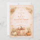 Warm, romantic, and effortlessly seasonal, this fall wedding design features a rich heirloom pumpkin surrounded by soft florals and delicate autumn foliage. A graceful botanical arch frames the wording, creating a balanced and elegant composition with subtle rustic charm. The warm neutral background and burnt orange accents make it perfect for an outdoor autumn celebration, barn wedding, or harvest-inspired event.