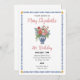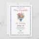 Cet invitation d'anniversaire présente un portrait aquarelle d'un vase de style chinoiserie rempli de fleurs.
