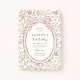 Charming coquette-style first birthday invitation featuring a delicate floral meadow pattern and an elegant pink bow detail. The scalloped oval frame and vintage-inspired flowers create a soft, storybook look perfect for a baby girl’s first birthday celebration. Inspired by cottagecore and classic heirloom designs, this floral birthday invitation is ideal for garden parties, spring birthdays, and sweet, feminine themes. A lovely choice for parents looking for a bow birthday invitation with a gentle meadow floral aesthetic.
