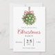 These Christmas party invites feature a watercolor portrait of a ball of mistletoe hanging up by a red and white stripped ribbon bow.