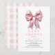 This coquette & cute girl's baby shower invitation features a big pink bow/ribbon. The reverse side features a white background with pink gingham plaids/checks. Personalize it for your needs. You can find matching products at my store.
