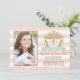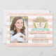 Add your favourite photo to these pretty, pale coral and white striped medical school graduation announcements and invitations with a caduceus flanked by two pink hearts and a green laurel wreath and the letters M D on each side of the caduceus. Customize the aqua blue hued banner with the year of the graduate's graduating class and your own wording on the back. The watercolor look peachy pink background is soft and feminine. A faux glitter look design outlines the circular logo and graduate's picture. The party invite can be personalized the graduate's name, med school, residency and party details. Please, note, no 3D embellishments have been added to this invitation. The artwork was created to simulate the look of glitter and texture. Artwork and design © Chrissy H. Studios, LLC. All rights reserved. Photo credit: Susie Moore Photography