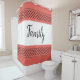 Coral Family shower curtain. Coral background with fun black pattern at top and bottom. White is in the centre with the word Family in a fun and pretty script typography. Fun and stylish!