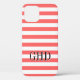 Coral and white striped monogram iPhone 12 case. Cute nautical theme phone cover with stripes. Personalizable background colour. Make your own text. name or monogram. Great personalized gift idea for men women and kids.