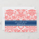 Mariage enregistrer la carte de faire-part date avec élégant et contemporain pêche rose orange rose, bleu marine foncé et blanc classique et vintage motif damassé floral. Personnalisable avec les détails de votre mariage, disponible dans une large gamme de produits mariages correspondants. Contactez-nous pour demander un changement de couleur ou un produit personnalisé.
