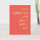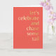 Faux gold gradient text that reads "let's celebrate and chase some tail ... cocktail." is fun and cheeky on a fresh coral red background. The editable message text inside lets you personalize this card for a more specific occasion.