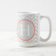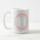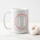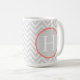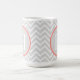 Enjoy your coffee or tea with a personalized Coral Chevron Monogram Coffee Mug. Coffee mug design features a light grey chevron pattern with a circle emblem outlined in coral. Additional items available with this design as well. Please contact me directly for assistance with personalization.