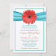 Coral Gerbera Daisy Aqua Ribbon Wedding Invitation