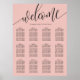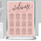 Organize your wedding reception in style with this elegant coral seating chart. The design features a modern, hand-lettered "Welcome" script paired with a clean serif font for guest names and table numbers. The vibrant coral background provides a beautiful pop of colour that complements a variety of floral arrangements and venue styles. This layout is perfectly structured to help your guests find their seats quickly and easily during the cocktail hour or entrance. It is an ideal choice for couples looking for a sophisticated, minimalist aesthetic for their big day.