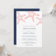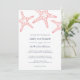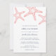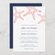 Modern coastal wedding invitation design features three vintage style coral starfish illustrations at the top, framing your wedding details in a chic mix of classic serif and modern sans serif typography. An elegant wedding invitation design in vibrant coral and navy for nautical, summer, or beach weddings.