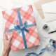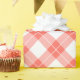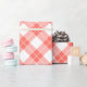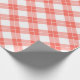 Colourful wrapping paper features coral, white, and light orange diamonds in a bold, buffalo plaid with thin white lines through the coloured diamonds.