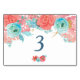 This wedding table number card uses bright coral pink combined with aqua blue, and embellishes it with touches of gold. The top border is a bouquet image of coral pink roses with aqua blue flowers and leaves. Below the floral border is your custom text in matching blue. A second miniature matching floral image is at the bottom. Everything is placed on a crisp white background. The back of the card is identical. Beautiful, classy, and perfect for spring and summer! Be sure to see the matching wedding products, including wedding invitations, in our store. *This design uses artwork from www.ephrazydesign.etsy.com.