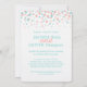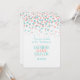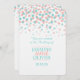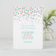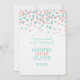Modern graphic random polka dot confetti effect wedding invitation in coral orange pink and aqua teal green blue hues. A simple contemporary, wedding invitation featuring falling confetti style dot graphic art. Perfect for a modern wedding. Edit these invitations with your own words. © Design and graphics by Sarah Trett. www.sarahtrett.com for www.mylittleedenweddings.com
