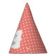 Coral pink and white polka dot pattern birthday party paper hats. The design features a white polka dot pattern on white and a white shape in the middle with your custom text.