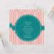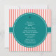 The design features an alternating coral pink and white stripes pattern on the background. An elegant striped pattern and in the middle there is a teal circle where to add your invitation's text.