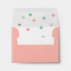 Personalize with your return address this coral pink wedding invitation envelope featuring a patterned interior with a scatter of pretty pastel dots in aqua, mint green, coral pink and tan with accents of faux copper foil. Change the background colour and the text colour by clicking the "Customize it" button.