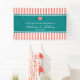 Wedding welcome banners. The design features an alternating coral pink and white stripes pattern on the background. Also the design features bride's and groom's initials separated by a pink heart. An elegant striped pattern with monograms and in the middle there is a teal circle.