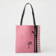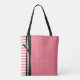 Chic designer looking carry all tote bag, done in coral with a tiny white polka dot pattern, with one side of the bag done in a coral and white striped pattern. Graphics of a black three ribbon band, runs down between the two backgrounds, on both sides of the bag. A two letter monogram, on the bottom right front, of the bag, is ready to personalize. What a great gift idea for her.