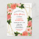 This fun and whimsical baby shower postcard features watercolor coral pink red roses and foliage on a gold geometric frame. The text combines handwritten script and serif fonts for a stylish and modern look. This is perfect for a spring or summer rustic baby shower.