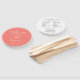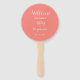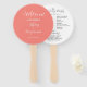 Wedding day program printed on a round style hand fan that features a trendy, coral colour background on the front side with the bride and groom names in white, stylized script. Back side of program lists the wedding party participants and ceremony rites on a white background with dark grey lettering. Edit hand fan and replace wedding program info with your own. Perfect for an indoor or outdoor wedding ceremony! Select number of hand fan programs desired.