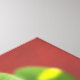 A green vine crawls around a coral coloured wall and corner. The contrast between colours is stimulating. Water beads can be seen on some of the leaves.