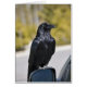 Un corbeau assez apaisé assis sur un miroir de voiture regardant et attendant des morceaux de nourriture. Photographié dans le parc national Yellowstone. Ajoutez votre propre texte personnalisé pour une occasion parfaite.